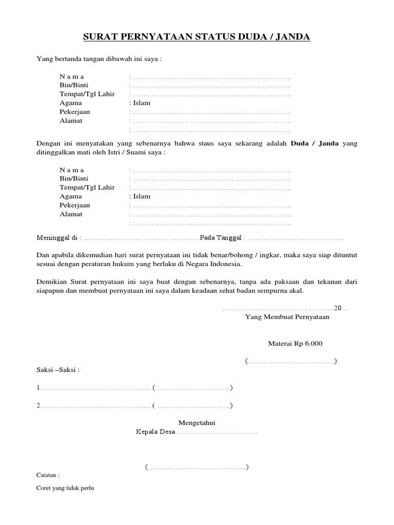 Surat keterangan kejandaan/kedudaan dari pamong praja/camat;; Berdasar data yang ada pada kami yang bersangkutan tidak/ belum menikah lagi. Surat keterangan janda / duda. Untuk contoh form surat keterangan janda duda silahkan download disini. Yang bertanda tangan dibawah ini kepala desa / kelurahan ds. Format contoh surat keterangan janda. Adalah janda / duda dari almarhum / almarhumah yang semasa hidupnya: Surat keterangan domisili instansi/lembaga · surat keterangan janda/duda cerai hidup/cerai mati · surat keterangan alasan cerai · surat keterangan belum pernah . Surat keterangan cerai mati menjadi salah satu dokumen wajib ketika seseorang yang sudah menikah menjadi duda/janda karena pasangannya meninggal dunia. Salinan surat keputusan pangkat dan gaji . Berikut contoh formulir surat keterangan kematian pasangan;. Contoh keterangan penghasilan orang tua untuk . Contoh surat keterangan domisili dari kelurahan / desa.