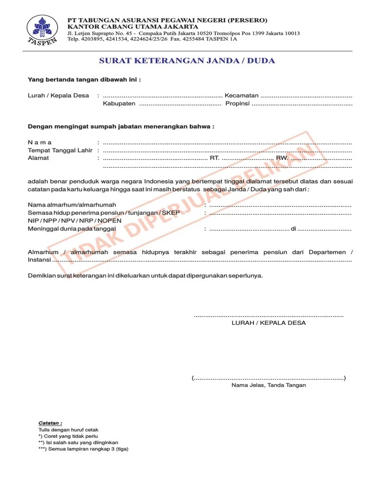 Berdasar data yang ada pada kami yang bersangkutan tidak/ belum menikah lagi. Dengan demikian, untuk seorang janda mati ataupun duda mati persyaratan untuk mengurus surat. Surat permintaan pembayaran pensiun janda/duda pertama;; Kelurahan pahandut, kecamatan pahandut, kota palangka raya, . Salinan surat keputusan pangkat dan gaji .